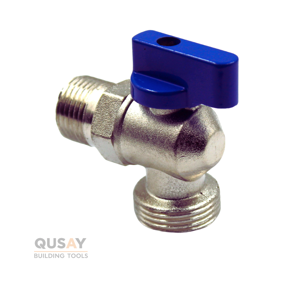 حنفية غسالة أو صمام زاوية يُستخدم بشكل شائع لتوصيل خراطيم الغسالات بالشبكة المائية. يتميز هذا الصمام بتصميمه العملي ومقبضه الأزرق للتحكم السهل في فتح وإغلاق تدفق المياه.