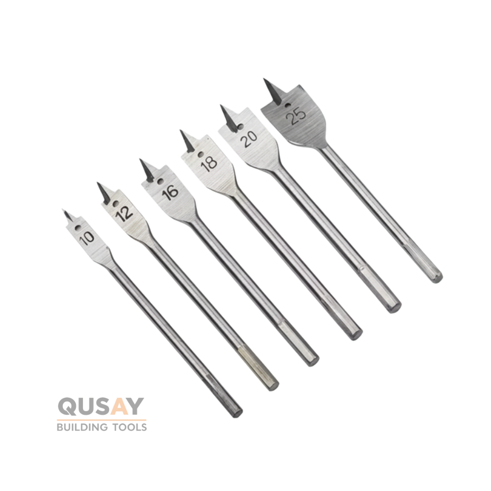 طقم ريش مثقاب مسطحة (Spade Drill Bits) مجموعة أدوات أساسية وعملية مصممة لثقب الخشب بدقة وسرعة. يتكون الطقم من 6 قطع بمقاسات مختلفة لتلبية احتياجات النجارة المتنوعة.