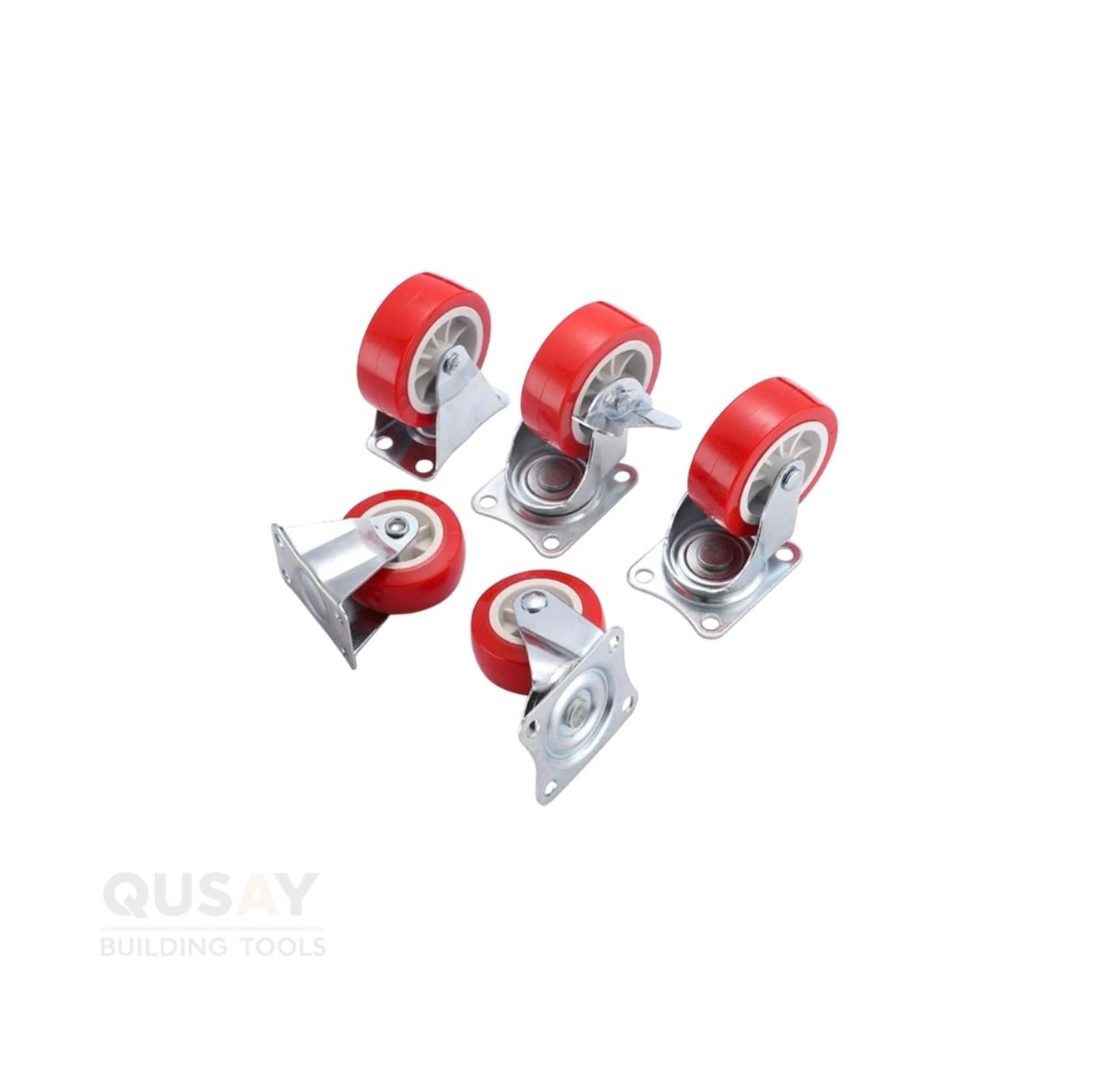 خامة بولي يوريثان (PU) متينة: العجلات مصنوعة من مادة صلبة باللون الأحمر الزاهي، مصممة لتحمل الأوزان الثقيلة ومقاومة التآكل مع الحفاظ على سلامة الأرضيات من الخدوش.