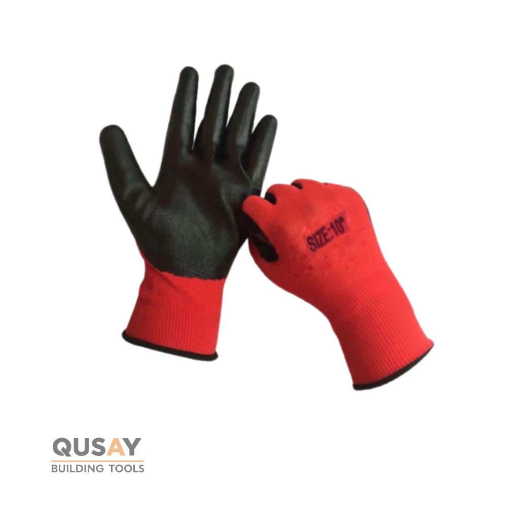 المادة: الجزء العلوي والسوار محبوكان من البوليستر أو النايلون (عادة باللون الأحمر)، بينما راحة اليد والأصابع مغلفة بطبقة من النتريل الأسود.