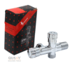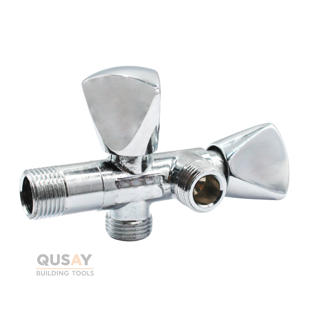 محبس زاوية بمخرجين (ثنائي الاتجاه) يُستخدم للتحكم في تدفق المياه في أنظمة السباكة، مثل توصيل الشطاف والغسالة أو السيفون في نفس الوقت.
