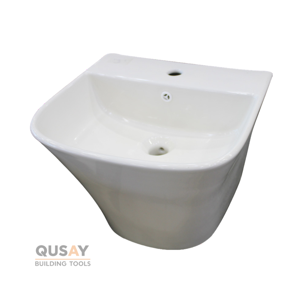 - تصميم مدمج (One Piece): تأتي المغسلة بهيكل متصل يدمج الحوض والقاعدة معاً، مما يوفر مظهراً انسيابياً متناسقاً ويخفي تمديدات السباكة ببراعة.