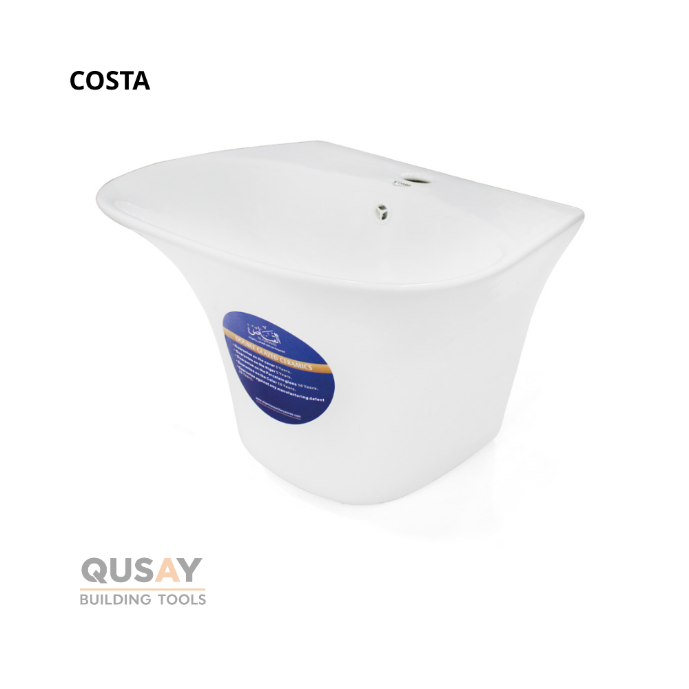 - تصميم مدمج (One-Piece): تأتي المغسلة بهيكل متصل يجمع الحوض والقاعدة في قطعة واحدة، مما يمنع تراكم الأوساخ في الفواصل ويسهل عملية التنظيف.