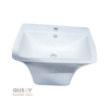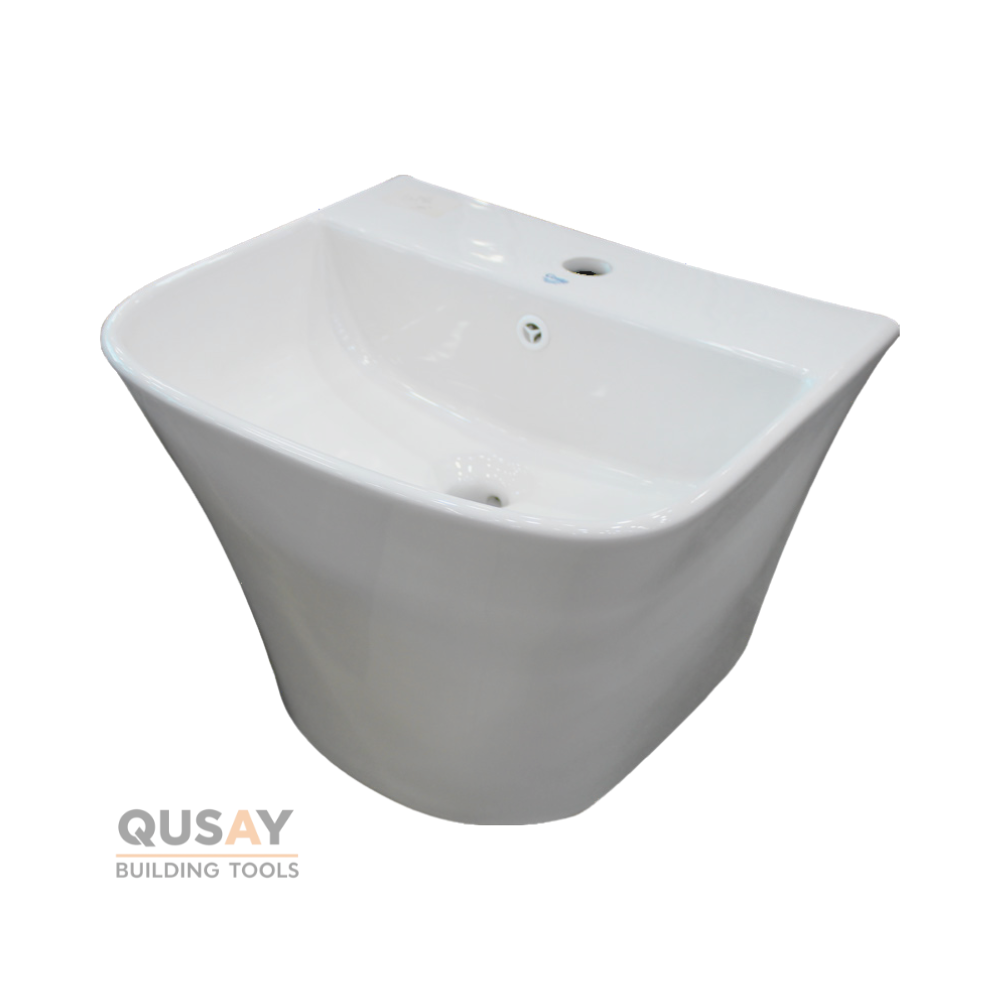- تصميم مدمج (One Piece): تأتي المغسلة بهيكل متصل يدمج الحوض والقاعدة معاً، مما يوفر مظهراً انسيابياً متناسقاً ويخفي تمديدات السباكة ببراعة.