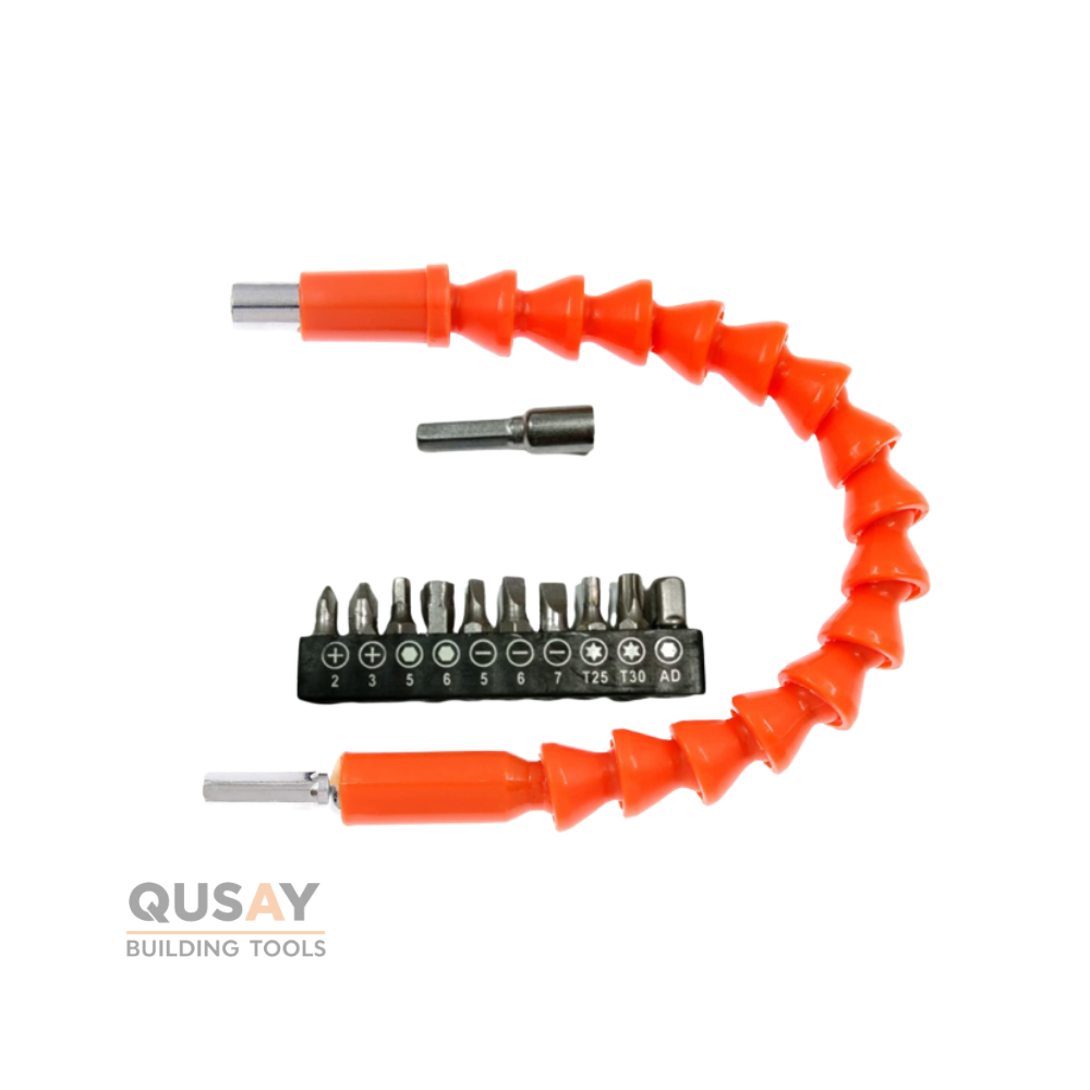 - طقم متكامل (12 قطعة): يأتي مع الوصلة المرنة مجموعة متنوعة من رؤوس المفكات (Bits) الأكثر استخداماً (مصلب، مسطح، وتوركس)، لتكون جاهزاً لأي مهمة صيانة فوراً.