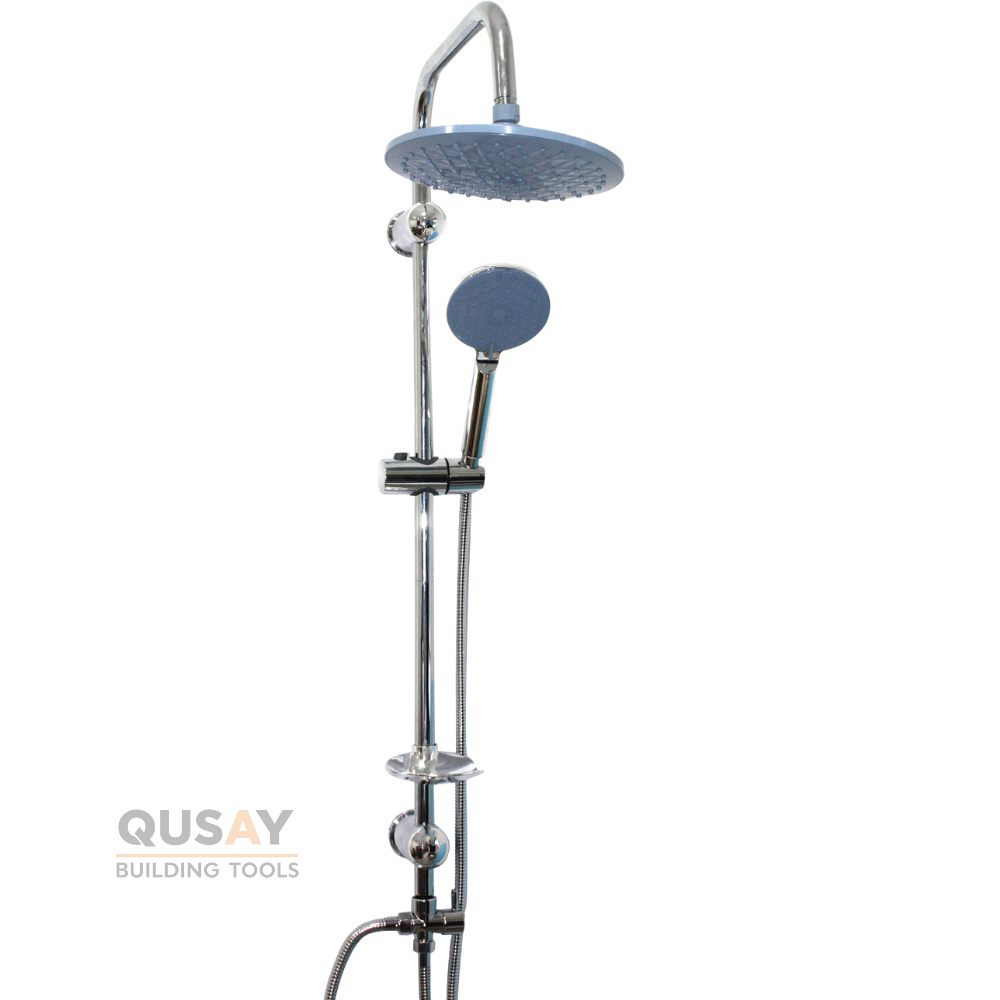 - المكونات: يتضمن رأس دش علوي دائري، ودش يدوي، وخرطوم، وعمود تثبيت قابل للتعديل، وصبانة، ومحول للتحكم بتدفق المياه.